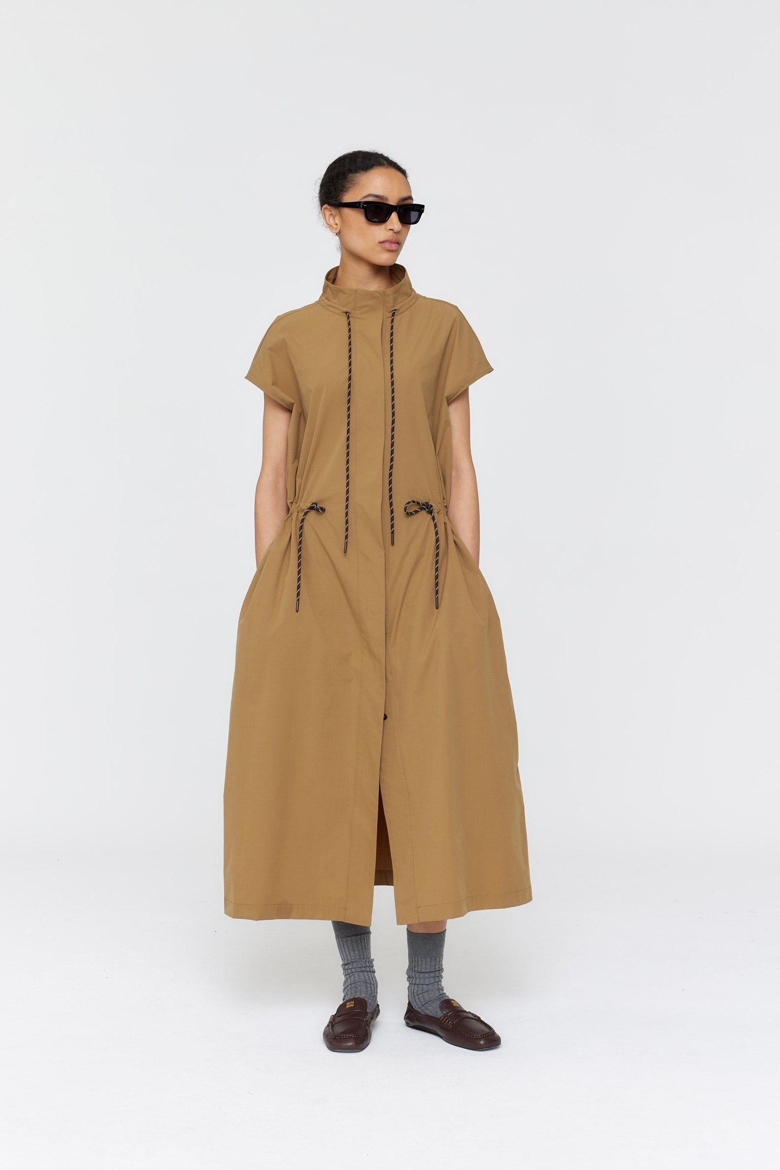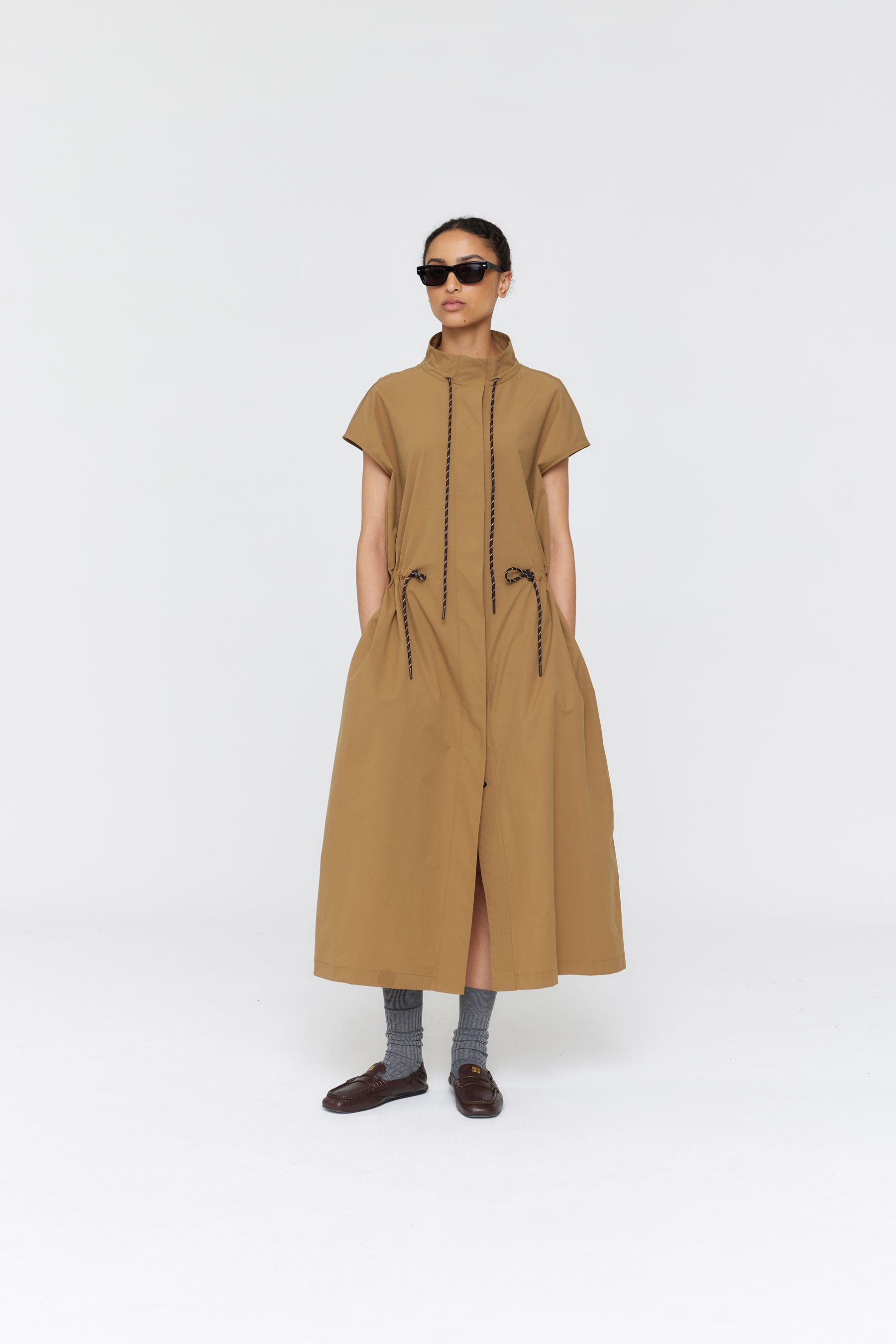 The Cecelie Dress features a hidden button placket and drawcord ties at the collar and waist, creating a flattering silhouette. Made from tan ripstop fabric, this sleeveless dress adds a touch of elegance to any occasion.