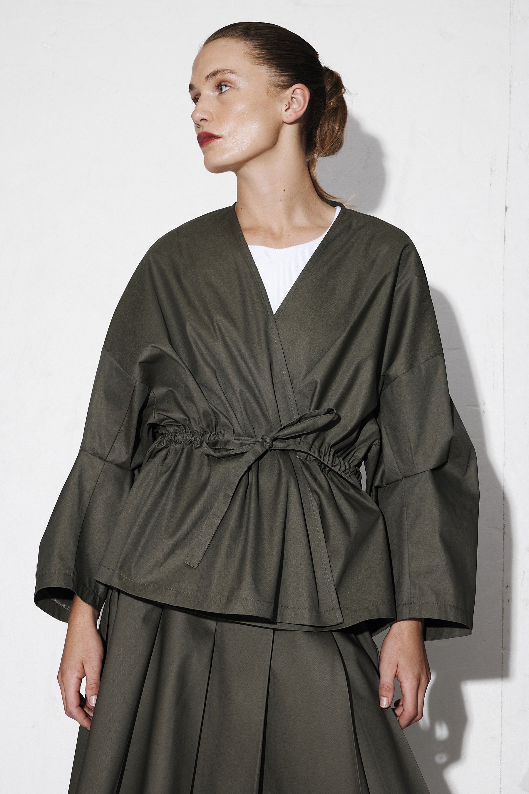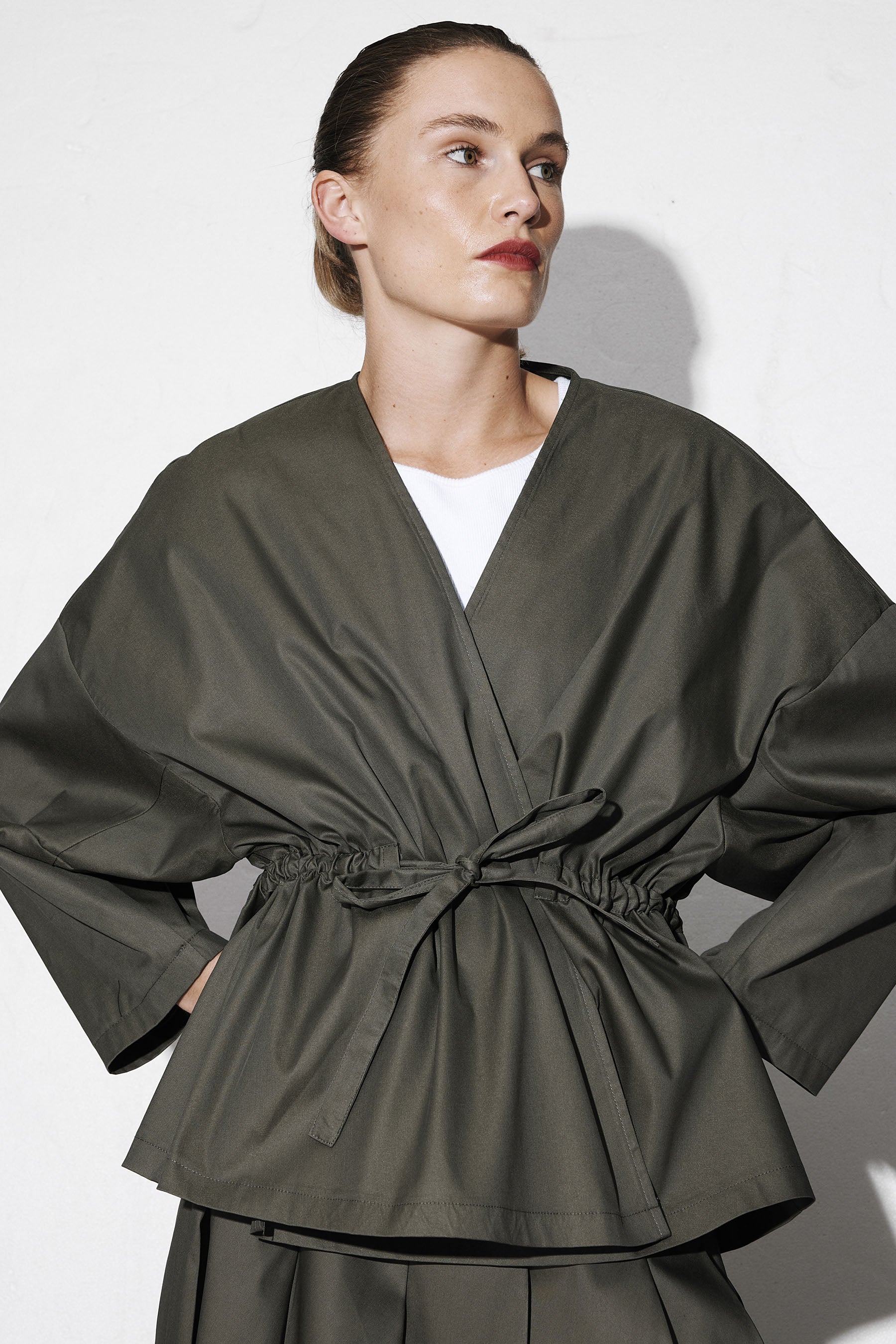 Introducing the Momoko Jacket. Crafted in cotton nylon. With its loose and relaxed fit, inspired by the haori style, it exudes a sense of laid-back sophistication. The dropped shoulders and wrist-length sleeves add to the relaxed silhouette. The ruched, drawstring styled belting provides a touch of versatility, allowing you to adjust the length to hit just above the hips when tightened or at the hips when left loose.