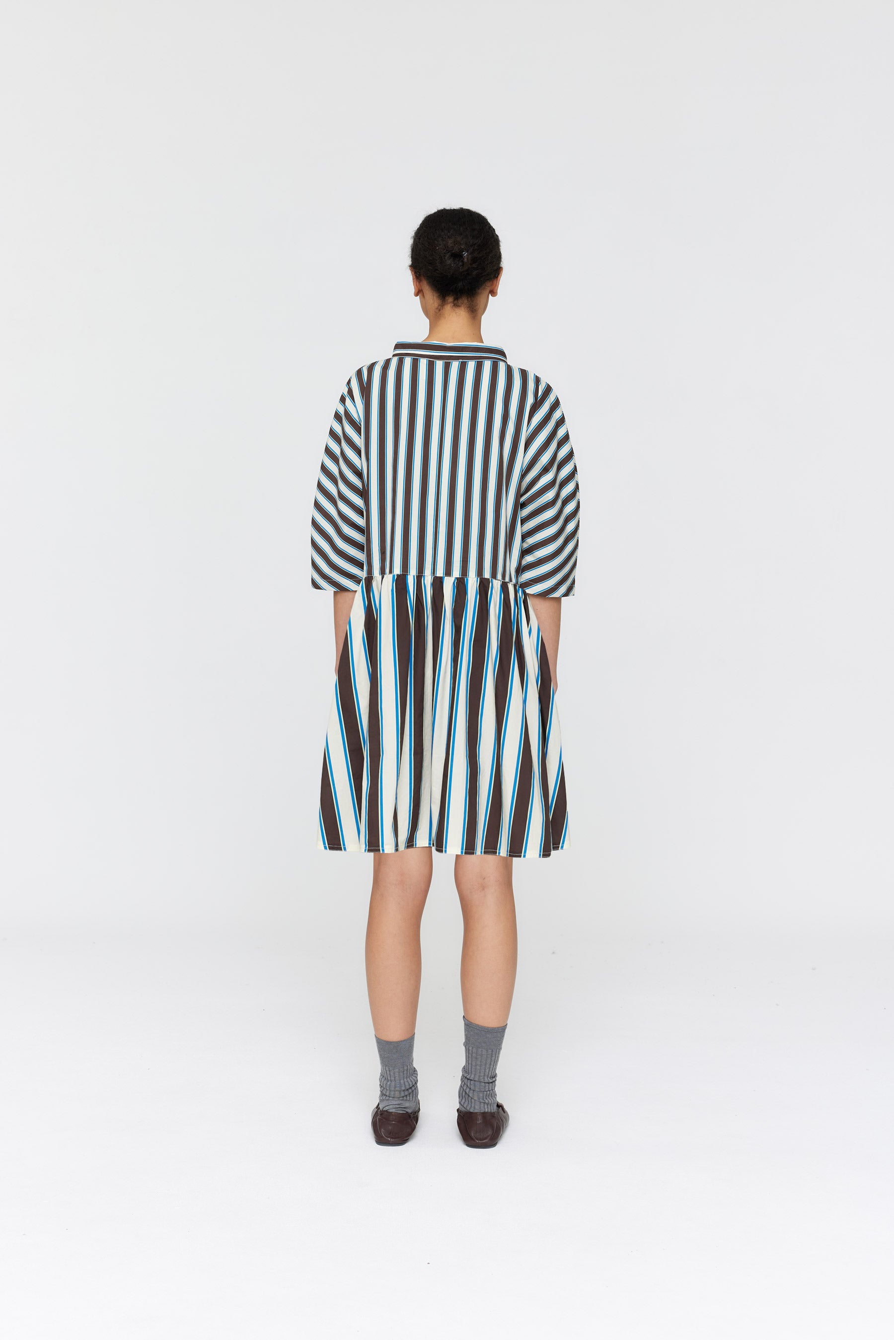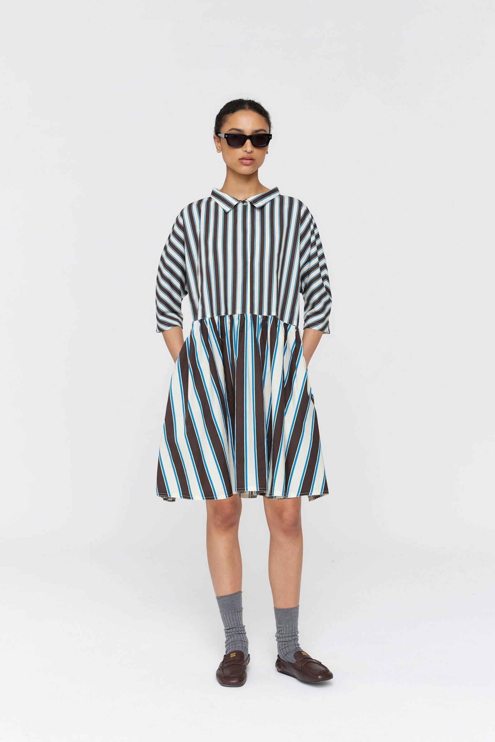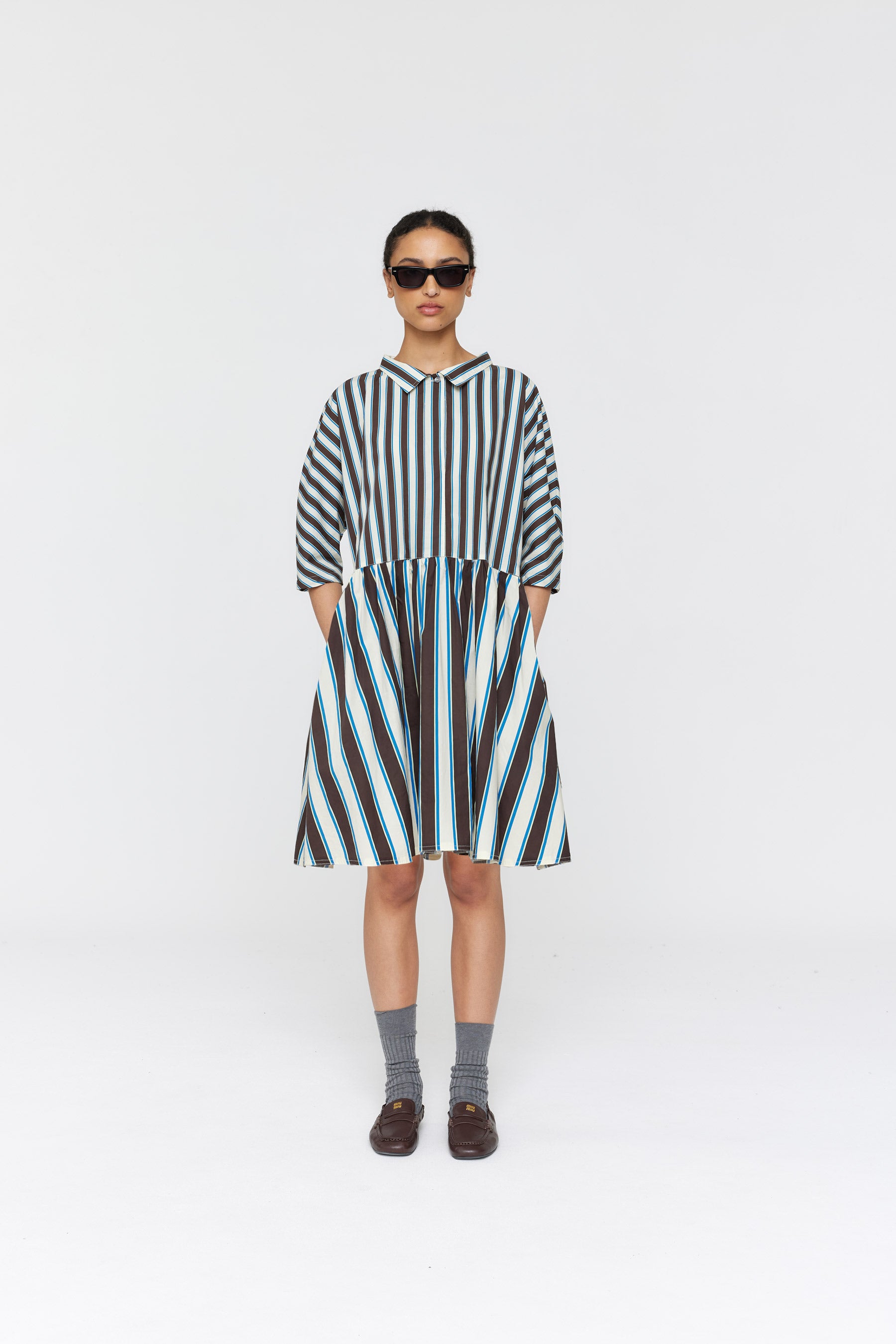 This versatile knee-length shirt dress captures the essence of effortless style. Made from crisp cotton poplin in exclusive stripe print, it features a three-quarter placket, point collar, and gathered skirt, balancing casual and sophisticated. The Zizo Dress features elegant contrast ivory stitching and controlled tucks at the front for a flattering fit.
