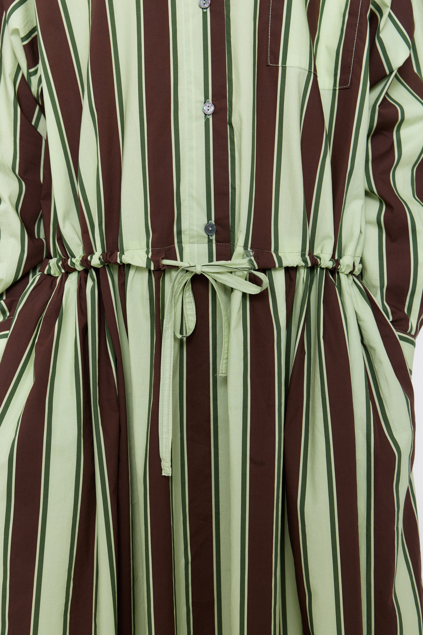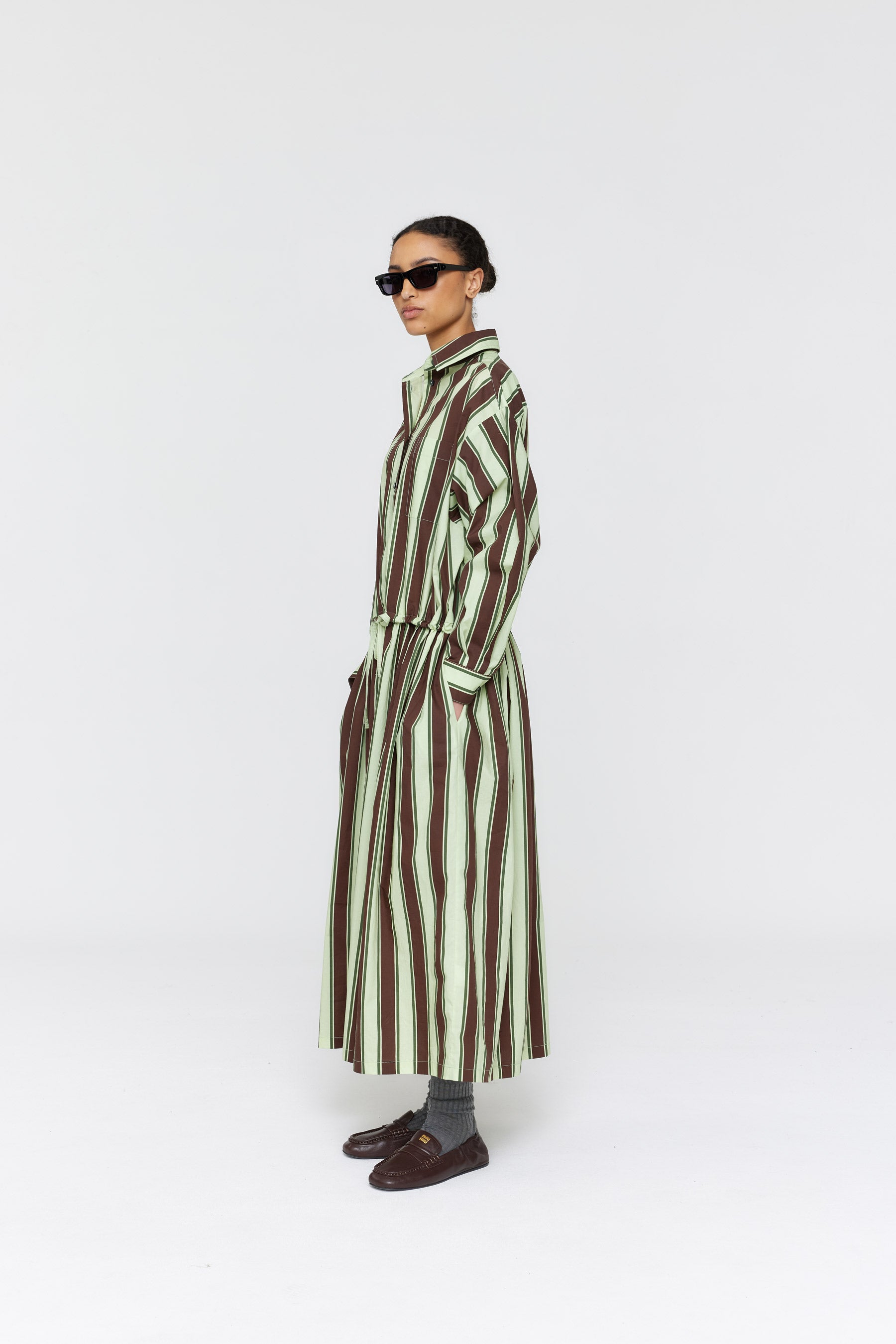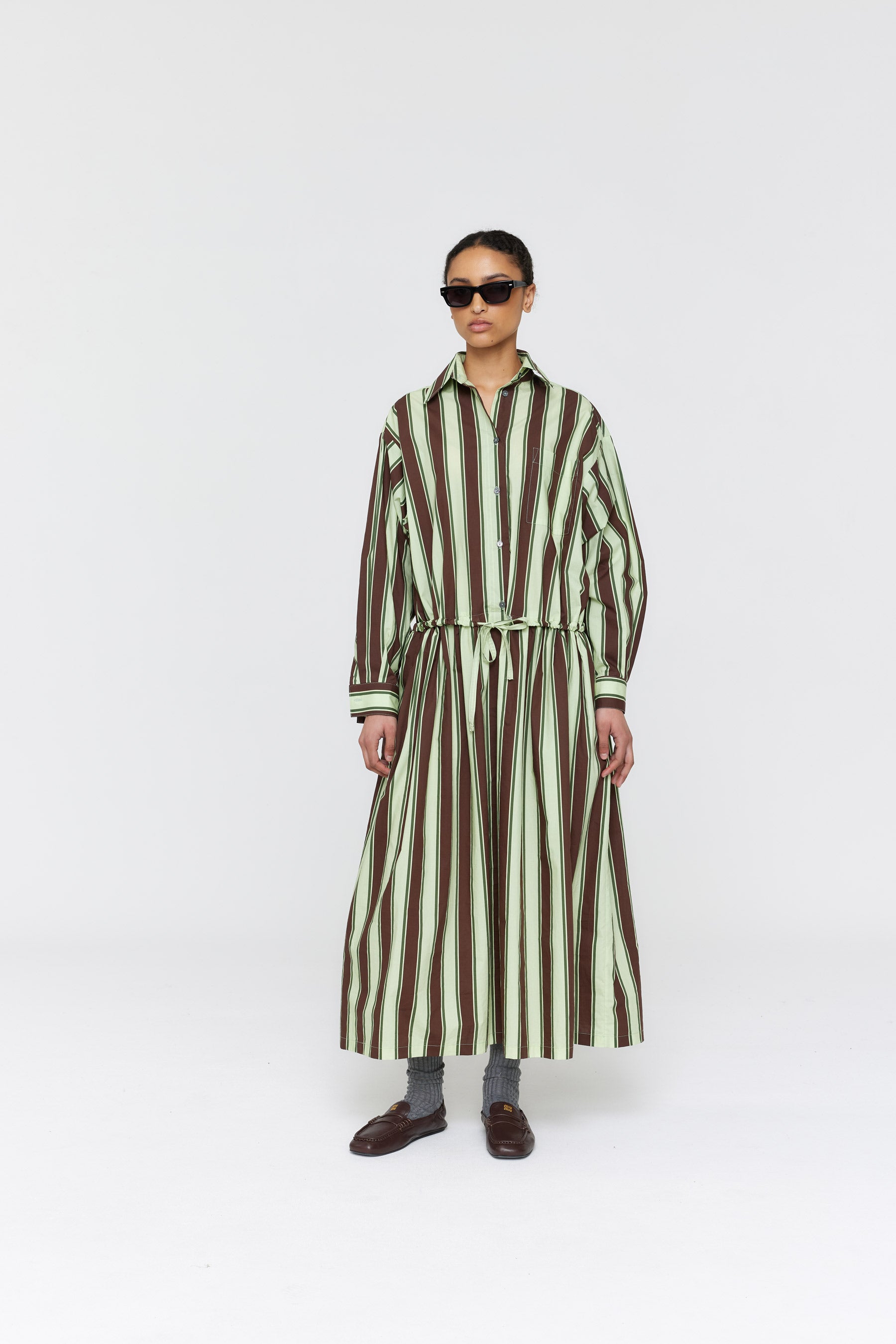 The Arthur Dress showcases a distinctive stripe print in a sophisticated silhouette designed for versatile styling. This long-length shirt dress features a crisp collar and structured cuffs that anchor the design, while a button front closure allows for easy layering and adjustment. Thin self-tie details at the waist define the silhouette, and the gathered skirt creates movement and dimension. A refined piece that transitions seamlessly from professional settings to elevated casual wear.