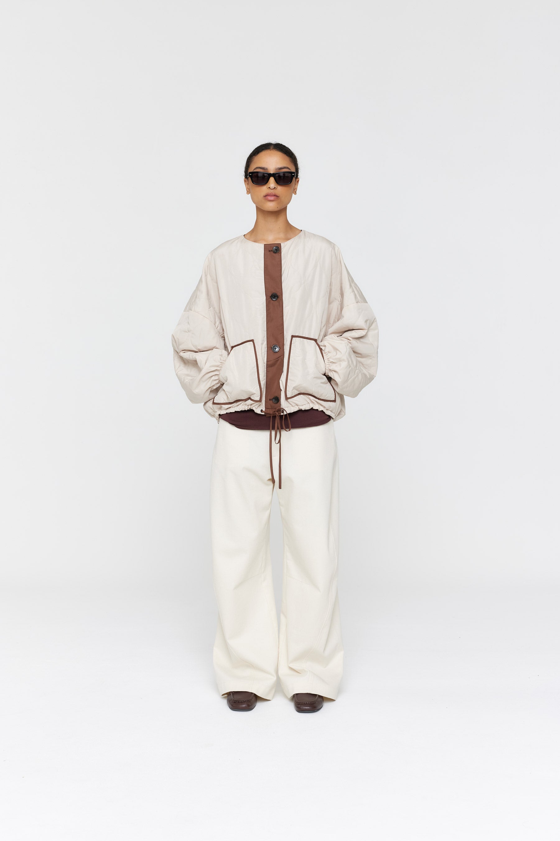 Stay warm and stylish with our Padded Forster Jacket. This quilted jacket is lightweight and features two large contrast patch pockets for convenience. The generous, dropped shoulder fit is complemented by contrast binding edges. Cropped length with fine drawstring ties on the waist.  With its reversible design, the jacket is quilted on one side and lightly padded on the other.  This jacket is perfect for any occasion.